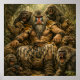 A powerful mandrill sits on a throne made of wood, surrounded by fierce-looking primates. The setting is a dense jungle, adding to the wild and intense atmosphere.