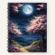 Trees lining a stone pathway bloom pink, framing a full moon with flowers, on this beautiful spiral notebook. Perfect for anyone who loves flowers and gardens.