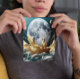 A man in a boat fishes under a massive, glowing moon. The scene is surreal, with the boat and the surrounding landscape appearing to be made of gold. Dolphins swim in the waves below.