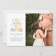 Share your joy over the upcoming arrival of the newest member of your family this holiday season with this photo pregnancy announcement. It features the words "the more the merrier" in colorful letters surrounded by snowflakes on the left with space for a photo on the right.