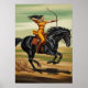 A thrilling Art Deco oil painting depicting a fearless female mounted archer in a vibrant saffron tunic at full gallop, her stylized geometric form defined by dramatic chiaroscuro lighting as she looses an arrow from a powerful, gleaming black horse.