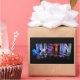 This image is a photograph of handmade letters, which change randomly, producing unique patterns and colors of light. The name Justin is reflected in still water, with floating foil hexagons. The letters look as if they're carved from crackled ice or crystal. If you can't find a name you want, please get in touch, and I'll put it on my list. Please see NamesInLights.co.uk for larger examples of the standard of photography on these products.