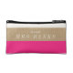 A great gift for a new bride. This little bag is perfect for getting all your makeup to the wedding or a perfect honeymoon carryall. Bold and bright pink offset the faux gold leather. Add your new last name and you wedding date to the back to make it truly one of a kind.