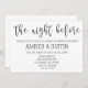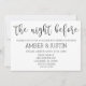 Plain white envelopes are included with paper invitations and will come to fit the invitation size you select. If you don’t need the envelopes, you may choose to not receive them by selecting the dropdown below "Envelopes" and choosing "None." If you’d like to have a design on your envelopes, you can browse all of these available envelopes to find the design that complements your The Night Before Invitation.