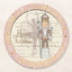 Beautiful coaster has music notes in the background and a nutcracker from the Nutcracker Suite, who is dressed in pale pink sequins and sparkles with a snowflake on his staff. It has a creamy pink border and snowflakes all around.