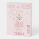 Super cute pink teddy bear is sitting on a pink and white geometric patterned block. He has a ruffled white collar and a party hat on. He's sitting below the moon and stars and the clouds. The words "teddy bear" can be changed if you wish to put something else, such as the child's name.