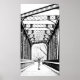 This is a cool black and white photo of a teen boy riding his longboard across a old metal bridge. This is a perfect example of something old and wonderful still being enjoyed with something new and wonderful.