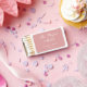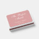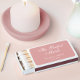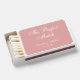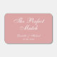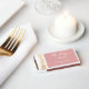 A simple wedding favor matchbox for a dusty rose wedding theme. The background is dusty rose (pink), all text is white.