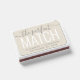 The Perfect Match Personalized Custom Matchbox Wedding Favors with a simple, modern, minimalist typography style with calligraphy handwriting and large sans-serif fonts and space for the couple's names and wedding date. Shown in light tan, gray, and white, but all colors can be changed using Zazzle's template editor. Contact Paper Grape Zazzle Store for help with coorinating items.