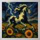 A pinto unicorn galloping through a sunflower field in a thunderstorm.