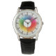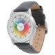 Modern and sleek vintage inspired color wheel watch. This quality timepiece is embellished with a lovely color wheel pattern from a nineteenth century vintage art illustration. "The Prismatic" is available in a large selection of style and strap options . "The Prismatic" wristwatch contrasts the sleek modern styling of today's fashion timepiece with very, very old school art illustration. A bold and uniquely artistic fashion statement. Govern yourselves accordingly...