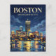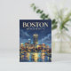 The atmosphere is intellectual and classic, with a color palette of deep navy, charcoal, and soft yellow. The scene captures the unique texture of Boston—the way the winding historical streets open up into a world-class metropolitan view.