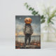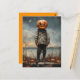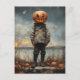 The image depicts a figure standing in an outdoor setting, wearing a worn-out, rugged military-style outfit with boots. Instead of a head, the figure has a large carved pumpkin with a menacing, glowing jack-o'-lantern face. The sky is overcast, giving the scene an eerie atmosphere, and the ground is scattered with dry vegetation and two small pumpkins, emphasizing the Halloween theme. The painting style is reminiscent of classic Americana, evoking a sense of both nostalgia and unease.