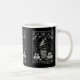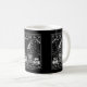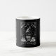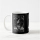 Grunge tarot card design for pumpkin spice latte lovers! The Pumpkin Spice. White and black illustration with a to-go coffee cup with whipped cream plus skeleton hand, jack-'olanterns, bat, creepy trees, and a ghost.