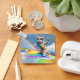 A high-quality, digitally rendered image featuring an anthropomorphic ginger and white cat in a full-body action pose. The cat is perfectly balanced atop a brilliantly colored rainbow surfboard, its gaze coolly hidden behind reflective orange-lensed sunglasses. It sports a snug, short-sleeved rainbow-striped top. The entire scene is set against a simple, pale gray backdrop to emphasize the subject's striking colors and motion.
