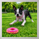 Luna the Boston Terrier is enjoying some recreation in the back yard playing fetch with her favorite toy.