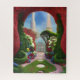Artistic puzzle features a fantasy garden dreamscape in Wonderland style dominated by red manicured shrubs and flowering plants. - A digital art painting created with AI generating software.