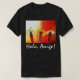 Still life of three red chili peppers wearing sombrerors made of lemon and tangerin against the textured background of hot and sunny Mexican day.T-shirt. Funny friendship theme. You can change the template text Hola, Amigo!