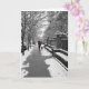 Under the canopy of a red umbrella, a woman walks her dog on a wintery, snowy day. This greeting card is fully customizable and ready to be personalized.