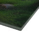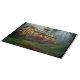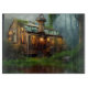 A Steampunk style workshop on a mossy river bank - a digital art glass cutting board design created with AI software