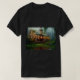A Steampunk style workshop on a mossy river bank - a digital art t-shirt created with AI software