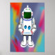 A white robot on a colorful background. This is a AI generated art piece.
