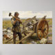 A rugged man with a sledgehammer stands beside a wooden wheelbarrow loaded with large stones. The scene is set in a rocky landscape under a gray sky.