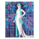 The Roses and the Night Art Deco print. Art Deco illustration from 1920s. French artist Georges Barbier painted lovely depictions of Paris during the 1920s. His work often featured ladies and couples in states of repose, ennui, and slight boredom. The Roses and the Night depicts a beautiful young blonde in an art deco era dress with green headscarf standing in front of a lattice of purple and blue miniature roses. A great gift for fans of Art Deco, Georges Barbier, and Vintage Art.