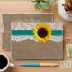 The rustic sunflower collection is a stunning design featuring a lovely rustic burlap effect background with a romantic vintage white lace effect trim finished with a stunning sunflower and teal green ribbon.