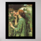 Vintage painting of young woman reaching toward soft pink roses. Fine art by English artist John William Waterhouse.