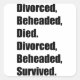 The classic rhyme that helps history buffs all over the world remember what happened to the six wives of Henry VIII (Henry the Eighth of England. Divorced (Catherine of Aragon), Beheaded (Anne Boleyn), Died (Jane Seymour), Divorced (Anne of Cleves), Beheaded (Katherine Howard), Survived (Katherine Parr).