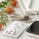This is an image of a snowman skiing down a hill of snow. He has an orange carrot for a nose and is wearing a pair of red gloves. He is skiing with red and yellow skis and orange poles. A swirly snow is on the reverse side of the keychain if applicable. These keychains come in assorted styles, and sizes. Customize with your own words.