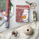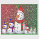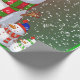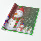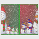 This image is of a snowman family, all dressed in their colored winter hats and scarves. A carrot for their nose and colored buttons for their eyes and mouth. A green and red backround with snow confetti has been added. A green border was also added. This wrapping paper is available in assorted styles and sizes.
