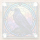 Depicted in stained glass, a spooky, creepy raven turns his gaze on the viewer.