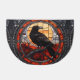 Depicted in stained glass, a spooky, creepy raven turns his gaze on the viewer.