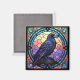 Depicted in stained glass, a spooky, creepy raven turns his gaze on the viewer.