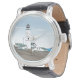 This drawing features a white, green and black lighthouse overlooking the sea. The sky is blue with a few clouds. White houses with green roofs surround the lighthouse. This design is available on women, men and children's watches.