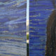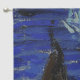 nighttime landscape painting of a swirly starry blue sky with a bright yellow crescent moon; the planet Venus is also visible. An exaggerated large cypress tree can be seen in the foreground.