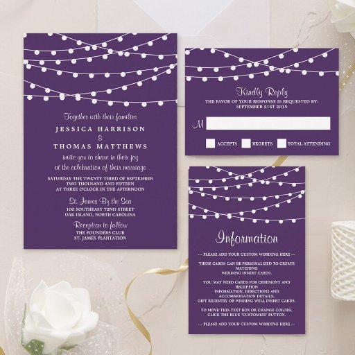 Simple yet elegant, the string lights on purple wedding collection is a stunning design featuring lovely white hanging string lights on a purple background, which is perfect for any modern wedding celebration.