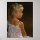 Dramatic portrait of a seated child in a flowered sundress, highlighted by a ray of sunlight. Original Photo digitally painted. Canvas texture embedded.