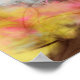 Poster with abstract art design. Bold splashes of pink, brown and yellow on clean, light blue background.