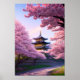 On top of a small hill, a wooden Japanese temple is encircled by a sea of exquisite cherry blossoms. The temple is a haven, a place to find peace and take in the wonders of nature.