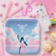 Feminine silhouettes stand beneath a cotton candy sky with a white transgender symbol in the sky like the bat signal, it has a heart in the middle.
