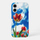 The blue sky serves as a serene backdrop, its clear expanse creating a striking contrast that makes the tulips appear even more vivid and alive. The sunlight bathes the flowers, enhancing their colors and bringing out the natural beauty of each bloom. Soft, fluffy clouds may be scattered across the sky, adding depth and interest to the scene.