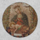 This beautiful painting is based on The Virgin Adoring the Christ Child with Two Saints (La Virgin adorando al Niño Jesús con dos santos) by Unidentified artist. Original public domain image from Los Angeles County Museum of Art. The artwork features a crowned Virgin Mary, with a serene expression and hands clasped in prayer. She is dressed in rich robes with intricate patterns, surrounded by radiant golden lines. Below her rests a sleeping baby Jesus, surrounded by a blanket with detailed designs. Two holy men are positioned beneath, the sacred heart between them. The background is filled with floral motifs and cherubs within clouds.
