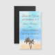 The design features tropical palm trees on a beautiful watercolor background of soft sand, cool blue sea and a stunning turquoise sky. Perfect for any beach celebration!