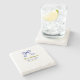 The wedding of gold navy blue bow couple name stone coaster