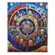 A.I. created interpretation of Houses with domed roofs and cylindrical structures are arranged in a radial formation, surrounded by glowing stars and planets in a celestial sky representing the wheel of time as it continues its journey into the future.