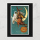A cute vintage Halloween illustration with a witch and her large while own sitting on a crescent moon with a jack o lantern hanging below
