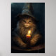 An adorable cat in a witch's hat with a candle